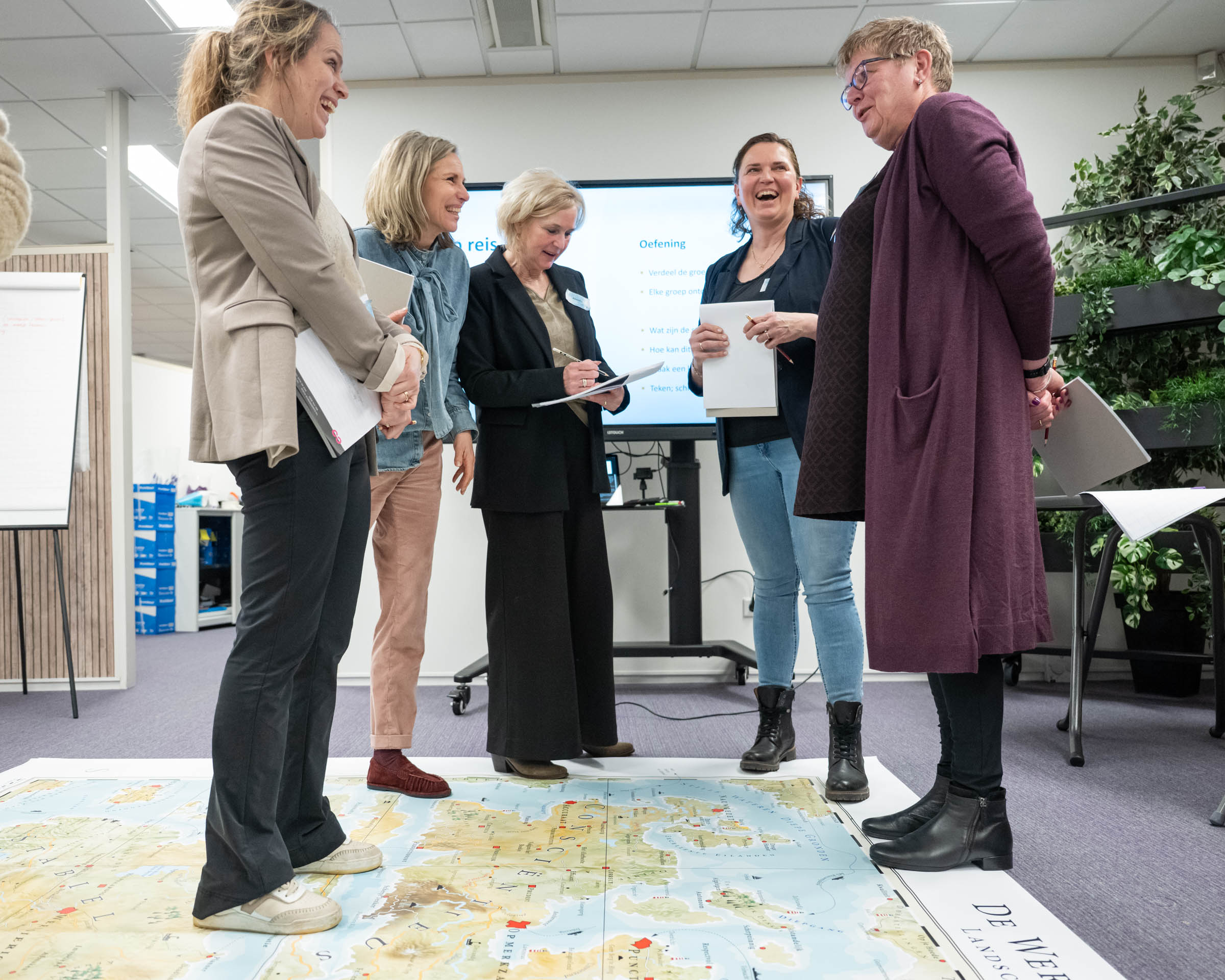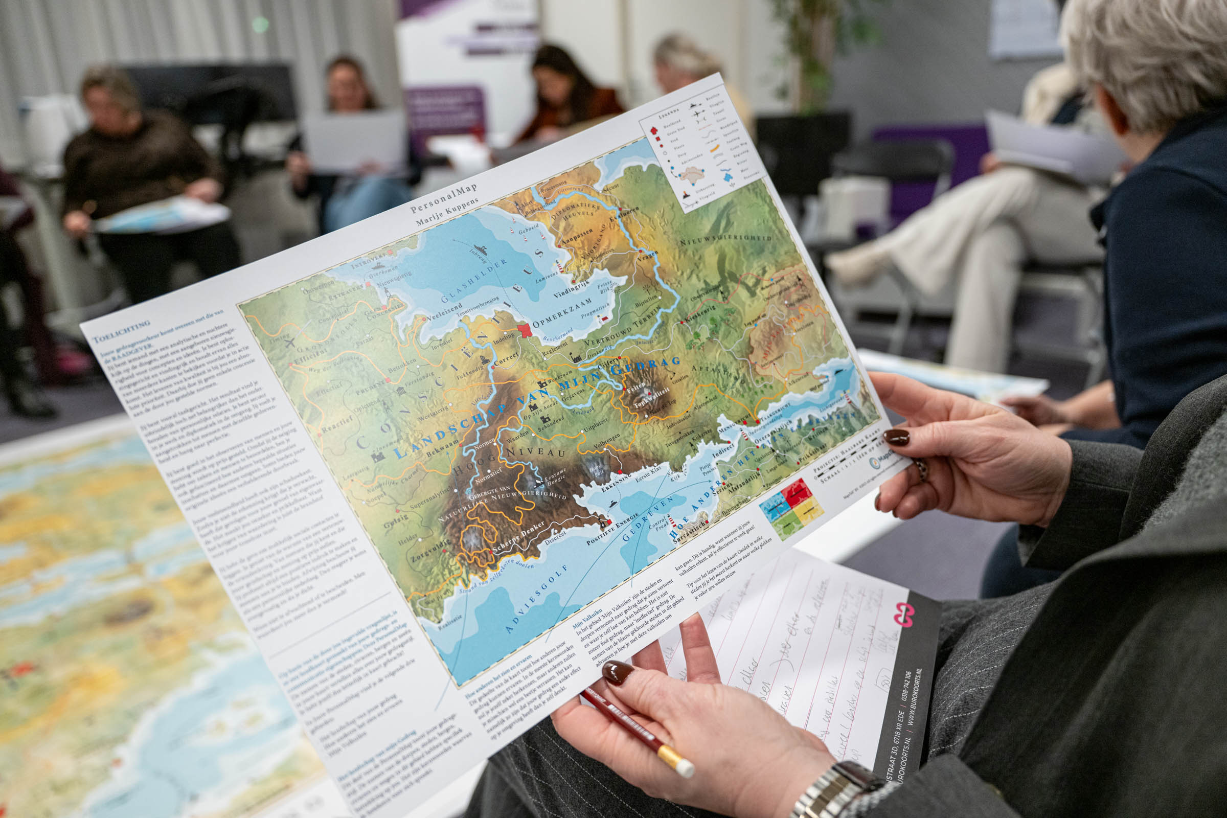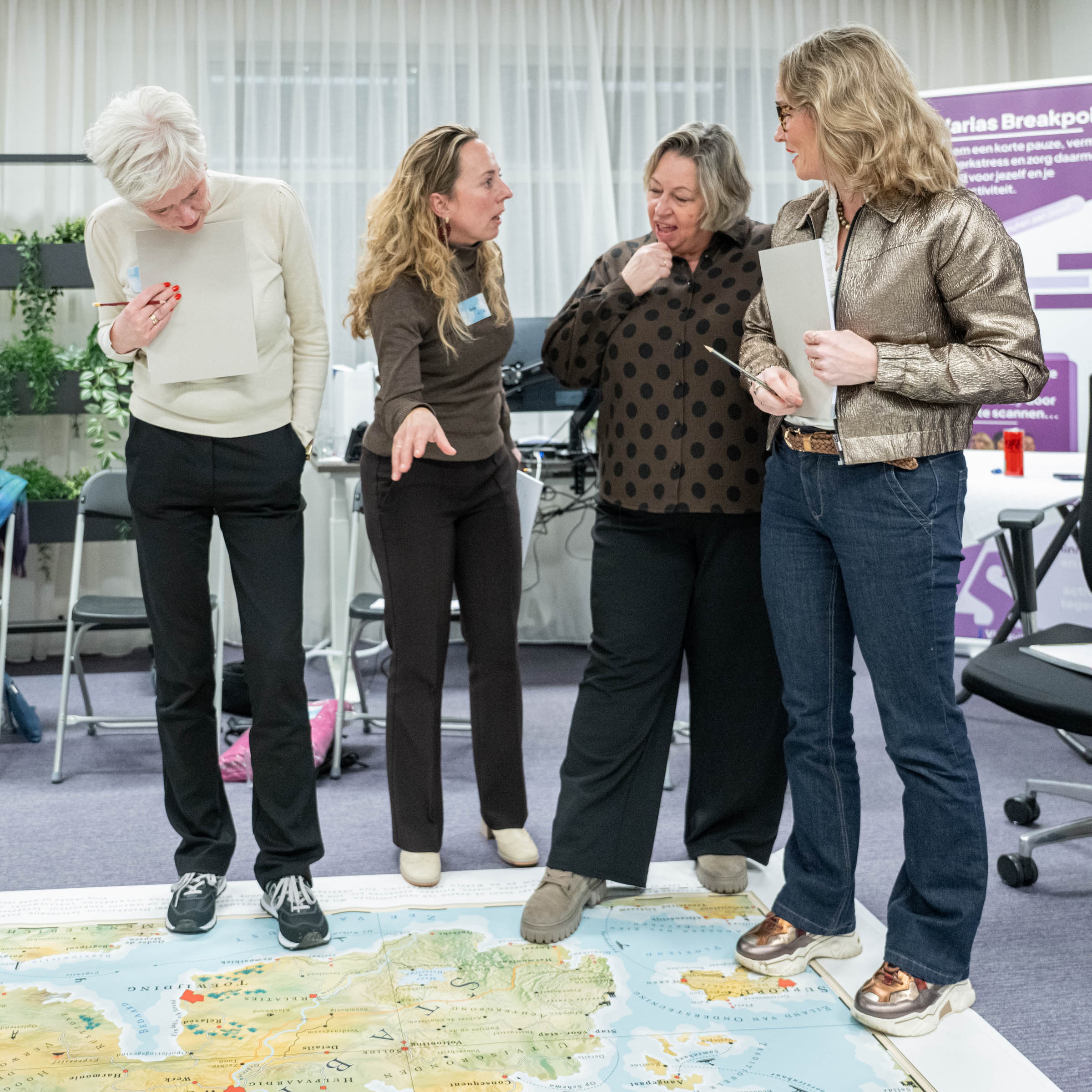 Donderdag 12 februari j.l. hebben wij, de leden vrouwen ondernemersnetwerk SWOT, mooie inzichten verworven in ons gedrag onder leiding van Herman en Frank Koot van Buro Koorts. Op basis van de door de dames van tevoren ingevulde vragenlijst is er een landkaart gemaakt van het gedrag en je communicatie eigenschappen, de zogenoemde: Personal Map van Mapstell. Daar is in te zien hoe je gedrag is, hoe anderen dat zien en ervaren en de valkuilen die je hebt. Het geeft soms verrassende inzichten en helpt je om effectiever te werk te gaan! Hoe introverte en extraverte mensen elkaar zien en de vooroordelen die daaraan kleven leverden hilarische momenten op. Een grote landkaart met gedragstypen was de basis en er werd heel wat gelachen om de vooroordelen die we allemaal hebben en hoe daar mee om te gaan!